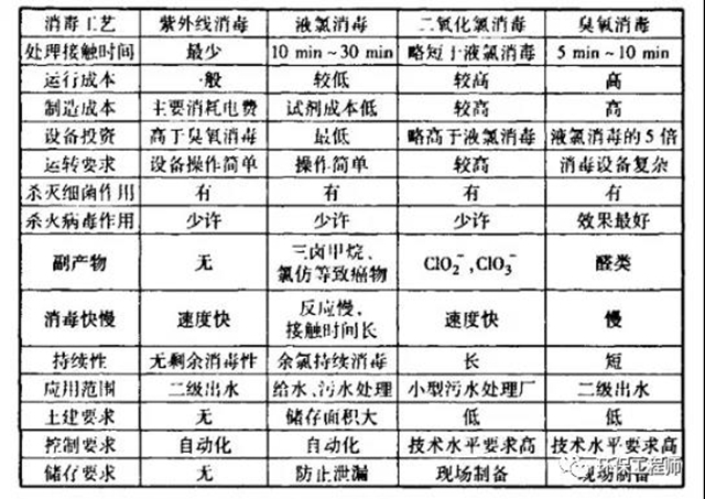 如表所示,幾種消毒方式目前在國內(nèi)均有運用。由于液氯消毒運行費用低,操作簡單,主要運用于大型污水處理廠。中小型污水處理廠主要采用二氧化氯和紫外線消毒,但由于紫外線消毒效果不穩(wěn)定,且設(shè)備維護費用較高等因素,二氧化氯消毒在中小型污水處理廠中運用越來越廣泛。臭氧消毒主要運用于中水處理,具有較強的消毒效果及脫色效果,同時再輔以加氯消毒,以保證出水中余氯要求。