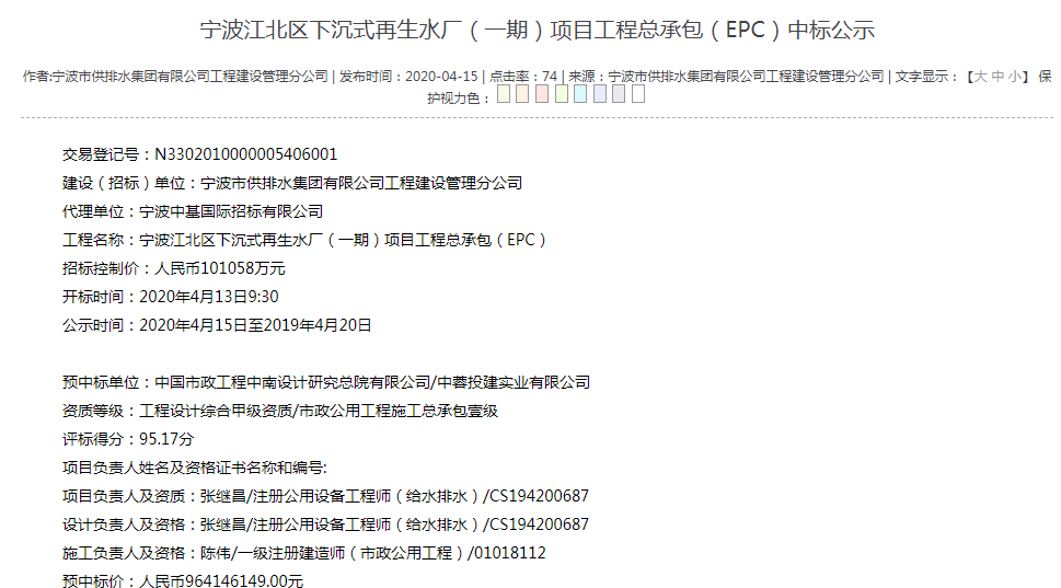近日,中國(guó)市政工程中南設(shè)計(jì)研究總院有限公司/中蓉投建實(shí)業(yè)有限公司預(yù)中標(biāo)寧波江北區(qū)下沉式再生水廠(一期)項(xiàng)目工程總承包(EPC),預(yù)中標(biāo)金額為964146149.00元。