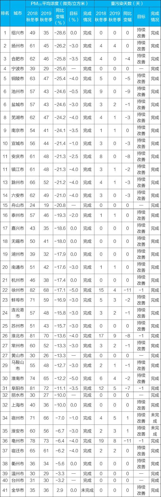 《長三角地區(qū)2019-2020年秋冬季大氣污染綜合治理攻堅行動方案》空氣質(zhì)量目標完成情況