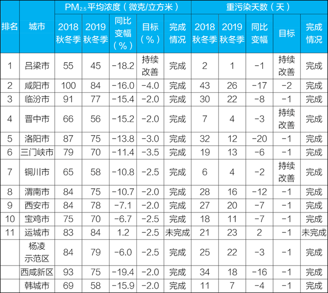 《汾渭平原2019-2020年秋冬季大氣污染綜合治理攻堅行動方案》空氣質(zhì)量目標完成情況