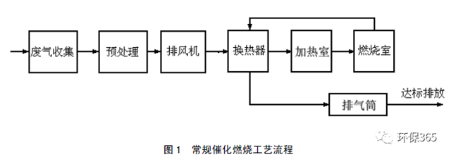 根據(jù)對廢氣加熱方式的不同,催化燃燒工藝可以分為常規(guī)催化燃燒工藝(見圖 1)和蓄熱催化燃燒工藝(見圖 2)。