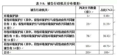 現(xiàn)實(shí)中,一些政府部門因環(huán)境問(wèn)題被起訴的案例頻頻見(jiàn)諸報(bào)端。報(bào)告從環(huán)境行政裁判文書的結(jié)構(gòu)分析指出,從2016年全年203份判決文書來(lái)看,基層環(huán)保部門是主要的被告行政機(jī)關(guān)。