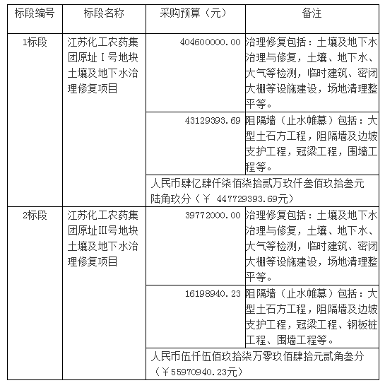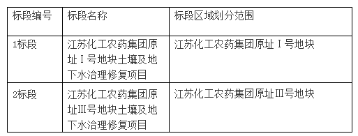 (1)本次招標(biāo)項(xiàng)目為江蘇化工農(nóng)藥集團(tuán)原址Ⅰ號(hào)、Ⅲ號(hào)地塊土壤及地下水治理修復(fù)項(xiàng)目共分2個(gè)標(biāo)段,分別為1標(biāo)段、2標(biāo)段。