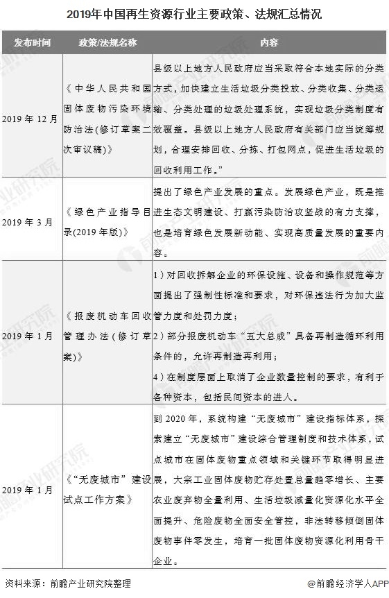 2019年,國務(wù)院辦公廳印發(fā)《“無廢城市”建設(shè)試點(diǎn)工作方案》的通知,并在全國范圍內(nèi)開展“無廢城市”試點(diǎn)工作。再生資源回收利用作為“無廢城市”建設(shè)的重要內(nèi)容,在國家政策利好的環(huán)境中,將迎來較好的發(fā)展前景。