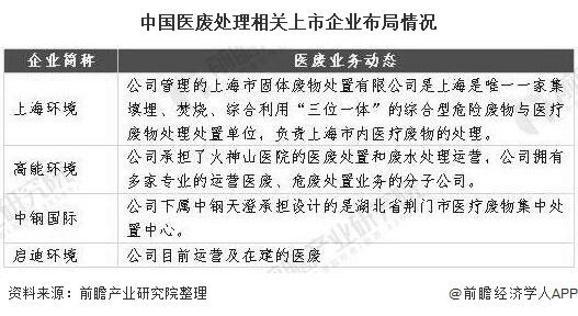 目前我國醫(yī)廢領(lǐng)域布局的企業(yè)較少,暫未形成激烈競(jìng)爭(zhēng)的局面,相關(guān)的上市公司有上海環(huán)境、高能環(huán)境、中鋼國際、啟迪環(huán)境等。以下是4家與疫情期間醫(yī)廢處理相關(guān)的上市公司的布局情況: