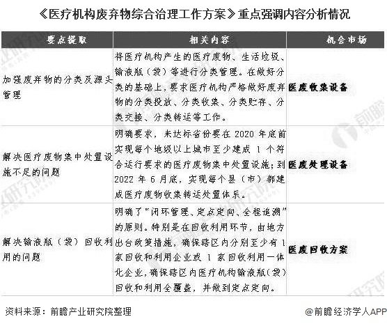 通過對(duì)該文件核心要點(diǎn)的解讀,可以看出未來與醫(yī)廢處理相關(guān)的醫(yī)廢處理設(shè)施、醫(yī)廢收集工具、醫(yī)廢回收利用方案等領(lǐng)域存在較大市場(chǎng)機(jī)會(huì)。