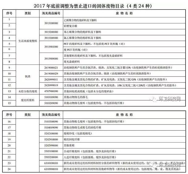 7 月 18 日,據(jù)路透社報(bào)道,中國(guó)已經(jīng)向世界貿(mào)易組織(WTO)提交了一份文件,聲明從 2017 年底開始,中國(guó)將禁止 4 類 24 種固體廢物入境,包括生活來源廢塑料、釩渣、未經(jīng)分揀的廢紙和廢紡織原料等高污染固體廢物。