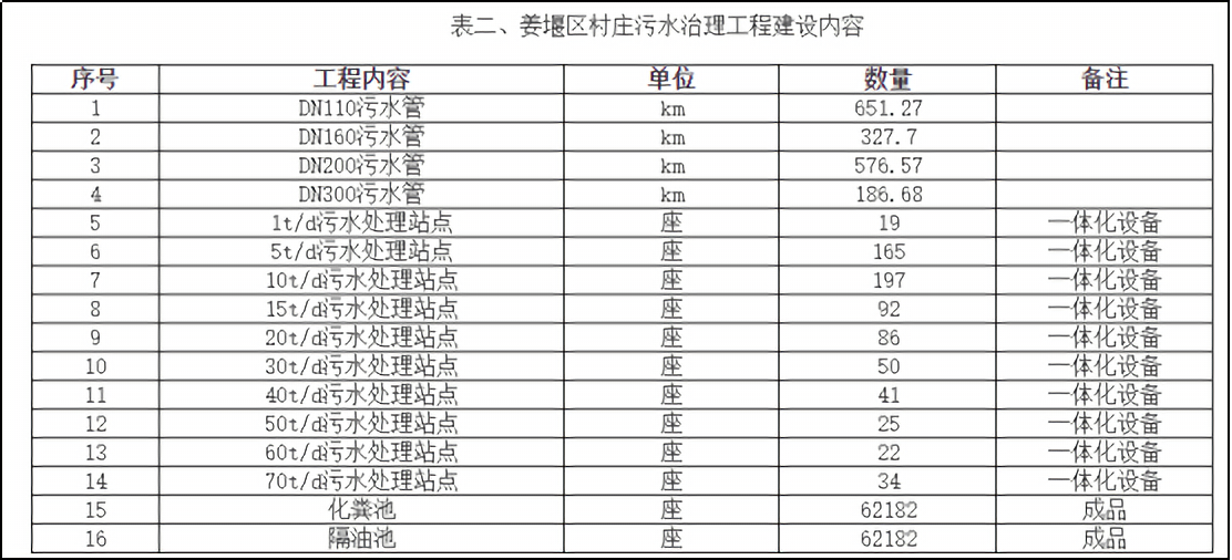 對于建制鎮(zhèn)子項目,該項目包括管網(wǎng)工程、泵站、化糞池、隔油池等的建設(shè),具體如下表所示: