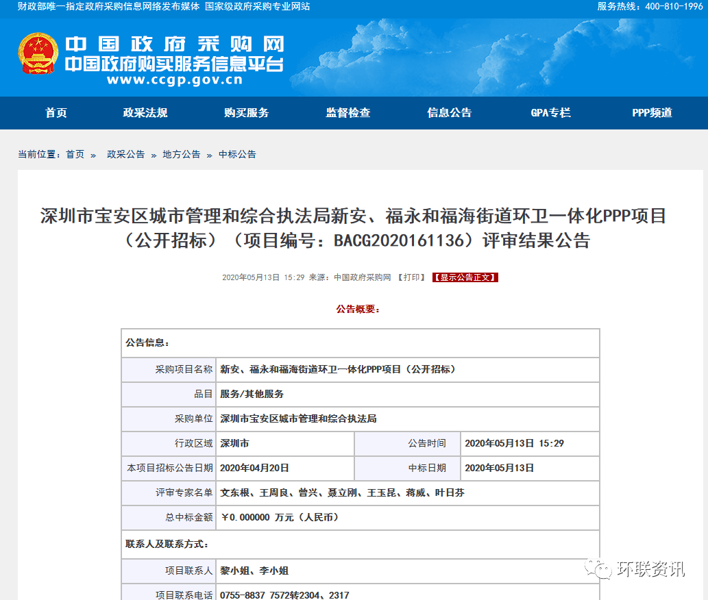5月13日,據(jù)中國(guó)政府采購(gòu)網(wǎng)消息,深圳市寶安區(qū)新安、福永和福海街道環(huán)衛(wèi)一體化PPP項(xiàng)目發(fā)布評(píng)審結(jié)果公告。