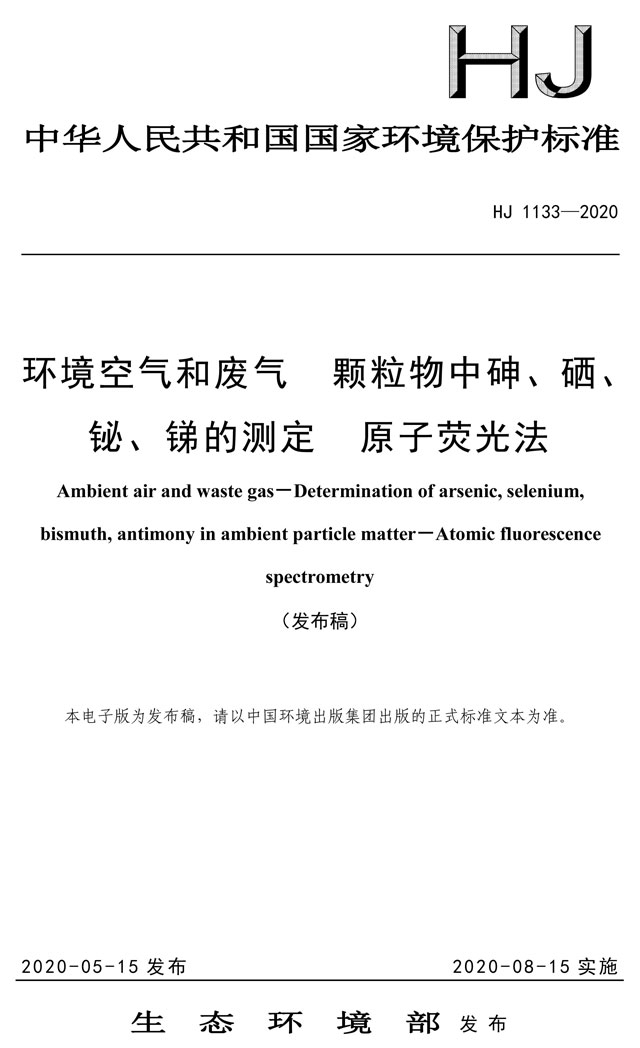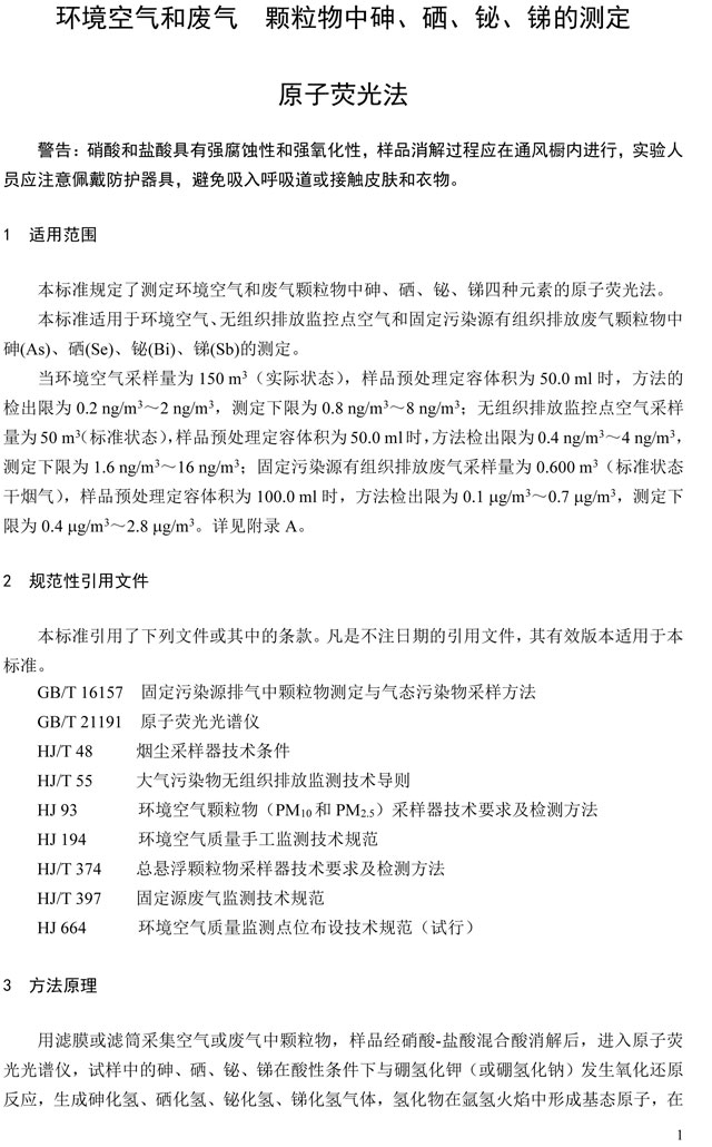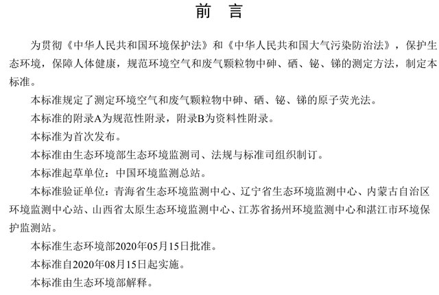 為貫徹《中華人民共和國(guó)環(huán)境保護(hù)法》和《中華人民共和國(guó)大氣污染防治法》,保護(hù)生態(tài)環(huán)境,保障人體健康,規(guī)范環(huán)境空氣和廢氣顆粒物中砷、硒、鉍、銻的測(cè)定方法,制定本標(biāo)準(zhǔn)。本標(biāo)準(zhǔn)規(guī)定了測(cè)定環(huán)境空氣和廢氣顆粒物中砷、硒、鉍、銻的原子熒光法。本標(biāo)準(zhǔn)的附錄A為規(guī)范性附錄,附錄B為資料性附錄。本標(biāo)準(zhǔn)為首次發(fā)布。