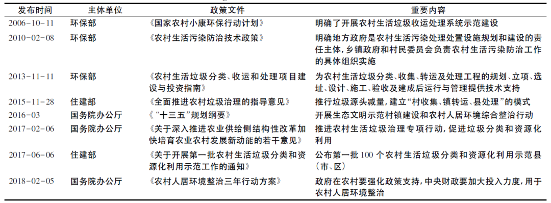 2016年12月21日,在中央財(cái)經(jīng)領(lǐng)導(dǎo)小組第十四次會(huì)議上,習(xí)近平總書記提出“要加快建立分類投放、分類收集、分類運(yùn)輸、分類處理的垃圾處理系統(tǒng),形成以法治為基礎(chǔ)、政府推動(dòng)、全民參與、城鄉(xiāng)統(tǒng)籌、因地制宜的垃圾分類制度,努力提高垃圾分類制度覆蓋范圍”。分別對(duì)近年來我國(guó)有關(guān)城市和農(nóng)村垃圾分類的主要政策進(jìn)行梳理,如表1和表2所示。