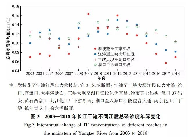 圖 3為2003—2018年長(zhǎng)江干流不同江段總磷濃度年際變化。由圖 3可見(jiàn),2003—2012年總磷濃度呈上升趨勢(shì),之后至2018年呈下降趨勢(shì),以上游下降最大,由0.16 mg/L降至0.07 mg/L,下降約56%.各江段所含斷面總磷濃度變化趨勢(shì)分析表明:上游江段的攀枝花斷面總磷濃度在2003—2008年較低,2009年出現(xiàn)高值,之后大幅下降,由2009年的0.19 mg/L降至2018的0.02 mg/L,下降約89%;宜賓和朱沱斷面的總磷濃度在2012—2018年分別下降了64%和52%;三峽庫(kù)區(qū)江段的寸灘斷面、沱口斷面、太平溪斷面總磷濃度在2012—2018年分別下降了53%、56%、50%。