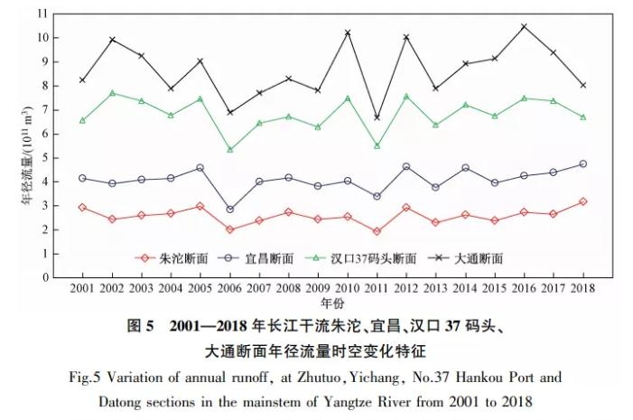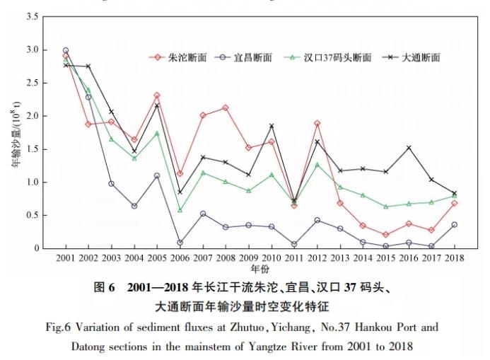 圖 5、6分別為長(zhǎng)江干流朱沱、宜昌、漢口37碼頭、大通斷面年徑流量和年輸沙量的空間分布特征及歷年變化趨勢(shì)。由圖 5可見(jiàn),2001—2018年朱沱、宜昌、漢口37碼頭、大通斷面年徑流量均在一定幅度內(nèi)波動(dòng),無(wú)明顯上升或下降趨勢(shì)。各斷面水量豐、枯年的出現(xiàn)不完全一致,如2018年朱沱、宜昌斷面表現(xiàn)為豐水年,而漢口37碼頭、大通斷面表現(xiàn)為枯水年,主要原因是2018年洞庭湖、鄱陽(yáng)湖來(lái)水偏少。對(duì)整個(gè)長(zhǎng)江而言,豐水年為2002年、2010年、2012年、2016年,枯水年為2006年、2011年。 2001—2018年大通斷面年徑流量平均值為8 652×108 m3,比1950—2000年年徑流量平均值(9 051×108 m3)[19]低了4.4%.由圖 6可見(jiàn),2001年后長(zhǎng)江干流年輸沙量變幅較大,朱沱、宜昌、漢口37碼頭、大通斷面2018年年輸沙量比2001年分別下降了76.6%、87.9%、72.1%、69.9%,以宜昌斷面降幅最大,2001年宜昌斷面年輸沙量為2.99×108 t,2018年降至0.362×108 t,發(fā)生了數(shù)量級(jí)的變化。