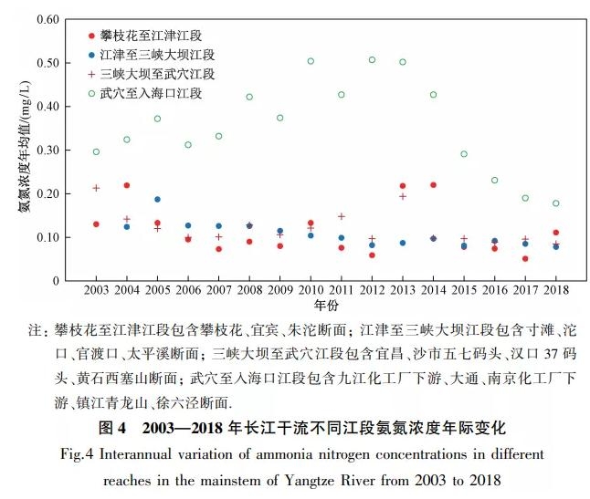 圖 4為2003—2018年長(zhǎng)江干流不同江段氨氮濃度年際變化。由圖 4可見(jiàn):武穴(位于中下游分界點(diǎn)湖口上游約70 km)至入??诮蔚陌钡獫舛茸兎畲?,2003—2012年基本呈上升趨勢(shì),之后至2018年顯著下降,由2012年的0.51 mg/L降至2018年的0.18 mg/L,下降約65%.對(duì)該江段所含各斷面濃度的變化分析表明,九江化工廠下游斷面氨氮降幅最大,由2012年的0.63 mg/L降至2018年的0.13 mg/L,下降約79%;大通、南京化工廠下游和鎮(zhèn)江青龍山斷面在2013—2018年下降分別為53%、78%、77%;徐六涇斷面氨氮濃度從2010年起總體呈下降趨勢(shì),由2010年的0.41 mg/L降至2018年的0.22 mg/L,下降約為46%.上游和下游變幅遠(yuǎn)小于武穴至入??诮?,僅個(gè)別斷面變幅較大,如三峽庫(kù)區(qū)江段的重慶寸灘斷面2010—2018年總體呈下降趨勢(shì),由2010年的0.16 mg/L降至2018年的0.06 mg/L,下降達(dá)63%. 2011年起,中游江段的沙市五七碼頭斷面氨氮濃度呈下降趨勢(shì),由2011年的0.28 mg/L降至2018年的0.10 mg/L,下降約60%.上游攀枝花至江津段氨氮濃度從2013年起也呈明顯下降趨勢(shì)。
