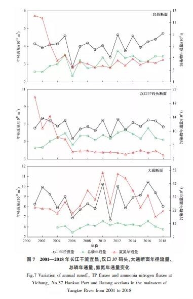 ③2000年以來(lái),長(zhǎng)江水量未有明顯增大或減小趨勢(shì),但輸沙量大幅下降??偭啄晖颗c年徑流量密切相關(guān),年內(nèi)豐水期總磷通量較高。2001—2006年宜昌斷面、漢口37碼頭斷面氨氮年通量大幅下降;2013—2018年,大通斷面氨氮年通量呈明顯下降趨勢(shì)。