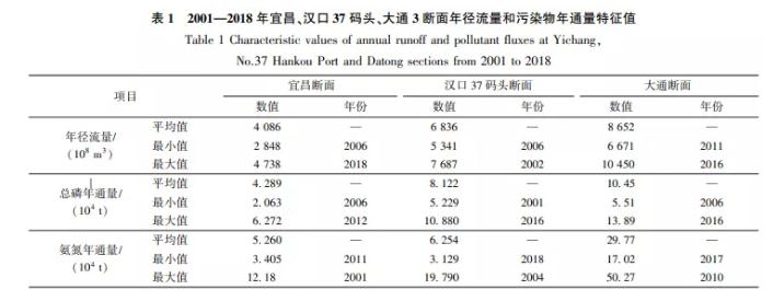 選取宜昌、漢口37碼頭、大通三個(gè)斷面,計(jì)算2001—2018年總磷和氨氮兩項(xiàng)典型污染物的年通量,并與年徑流量進(jìn)行變化趨勢(shì)對(duì)比,結(jié)果如圖 7所示。 表 1為2001—2018年宜昌、漢口37碼頭、大通斷面年徑流量和污染物年通量特征值。