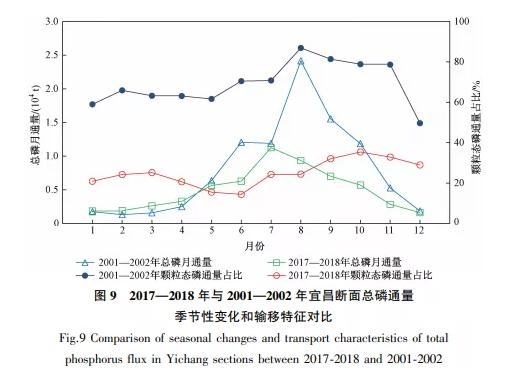 宜昌斷面為長(zhǎng)江上游控制斷面,是反映長(zhǎng)江干流金沙江梯級(jí)水庫(kù)、三峽水庫(kù)、葛洲壩水庫(kù)累積影響的第一個(gè)斷面。對(duì)該斷面2001—2002年、2017—2018年兩個(gè)時(shí)段總磷通量季節(jié)性變化特征和賦存形態(tài)進(jìn)行了對(duì)比(見(jiàn)圖 9)。由圖 9可見(jiàn):兩個(gè)時(shí)段總磷通量均為汛期高于非汛期,但2017—2018年季節(jié)間變幅明顯小于2001—2002年,這與其上游水庫(kù)尤其是三峽水庫(kù)對(duì)流量和泥沙的調(diào)控及緩沖作用密切相關(guān);另一個(gè)明顯特征是磷的輸移形態(tài)發(fā)生了較大變化,2001—2002年宜昌斷面通過(guò)顆粒態(tài)輸送的磷在磷輸送總量中占比為50%~87%,而在2017—2018年降為14%~35%,磷的輸移形態(tài)由以顆粒態(tài)輸送為主轉(zhuǎn)變?yōu)橐匀芙鈶B(tài)輸送為主。