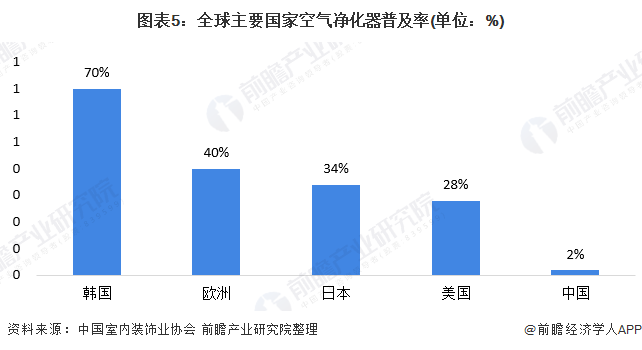 發(fā)達國家空氣凈化器的普及率遠高于發(fā)展中國家,其中韓國的普及率達到了70%,歐洲空氣凈化器的普及率為40%