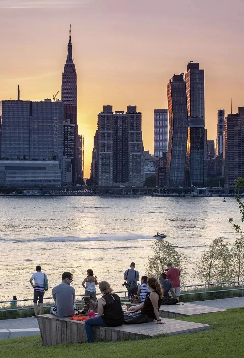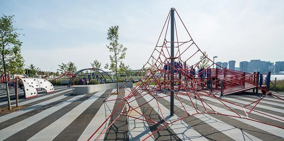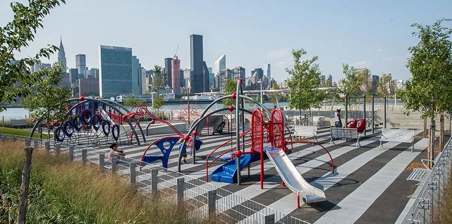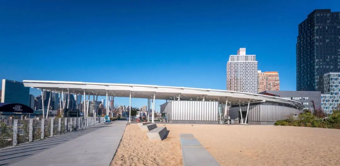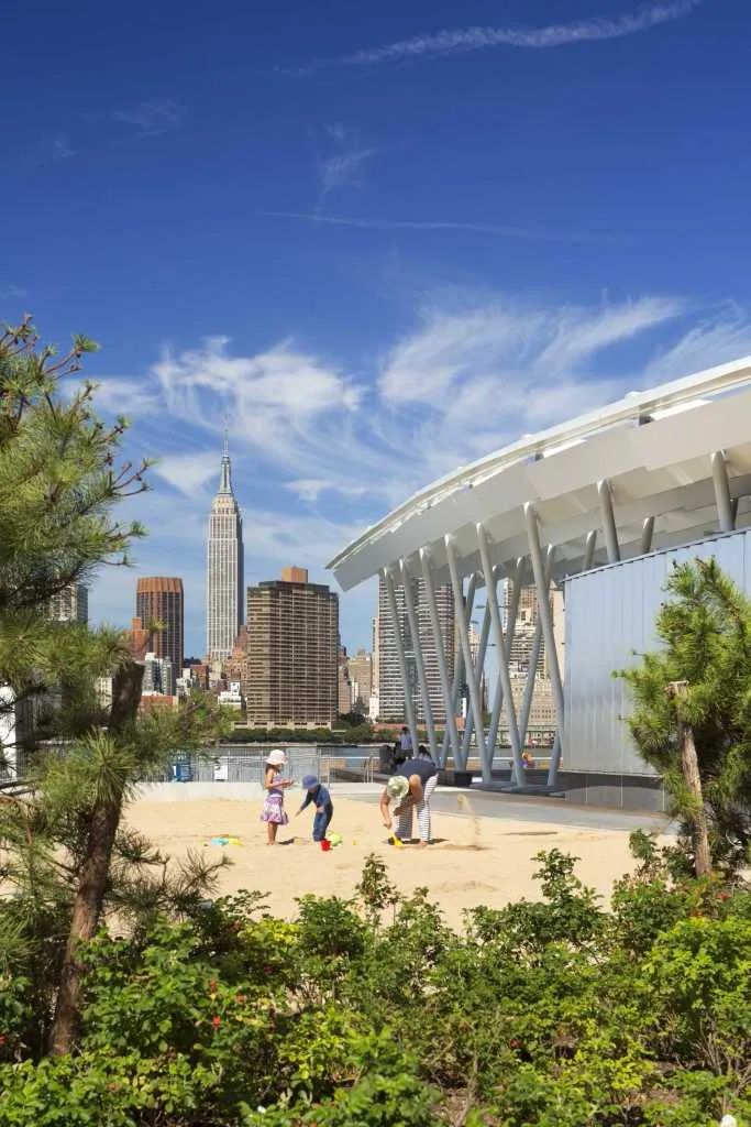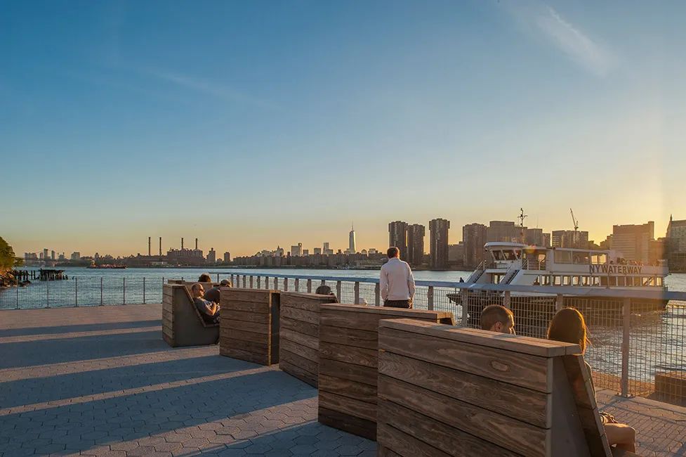 城市沙灘:在遮蔭長廊和公園步道的圍合中,一處充滿著休閑氛圍的城市沙灘為人們提供了日光浴、野餐、打沙灘排球的理想活動場地。在這里,游人們可以盡情地赤腳踏沙,嬉戲玩鬧間還可欣賞到曼哈頓天際處獨(dú)特的濱水落日景觀。