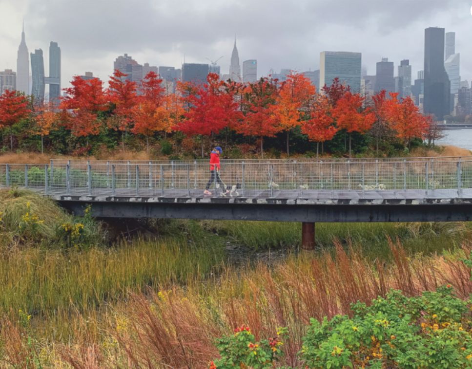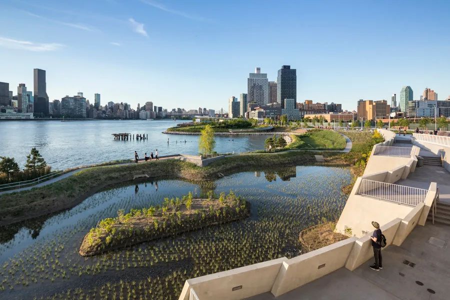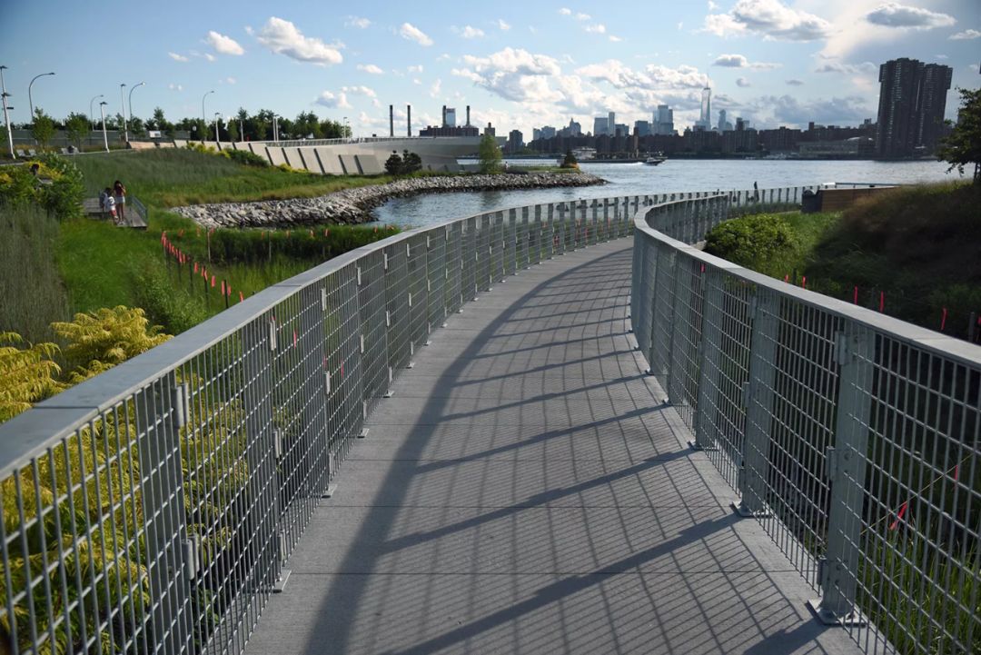 公園的二期工程起始于第54大道以南,整個設(shè)計地形豐富,通過不同的地勢,營造了許多有趣的空間。它包括一個半島空間、一個皮劃艇碼頭、幾個可以鍛煉和野餐的露臺,還有一個盤旋在濕地上空出挑的休息平臺,站在上面可以欣賞曼哈頓迷人的天際線。