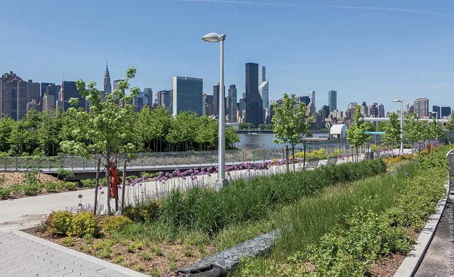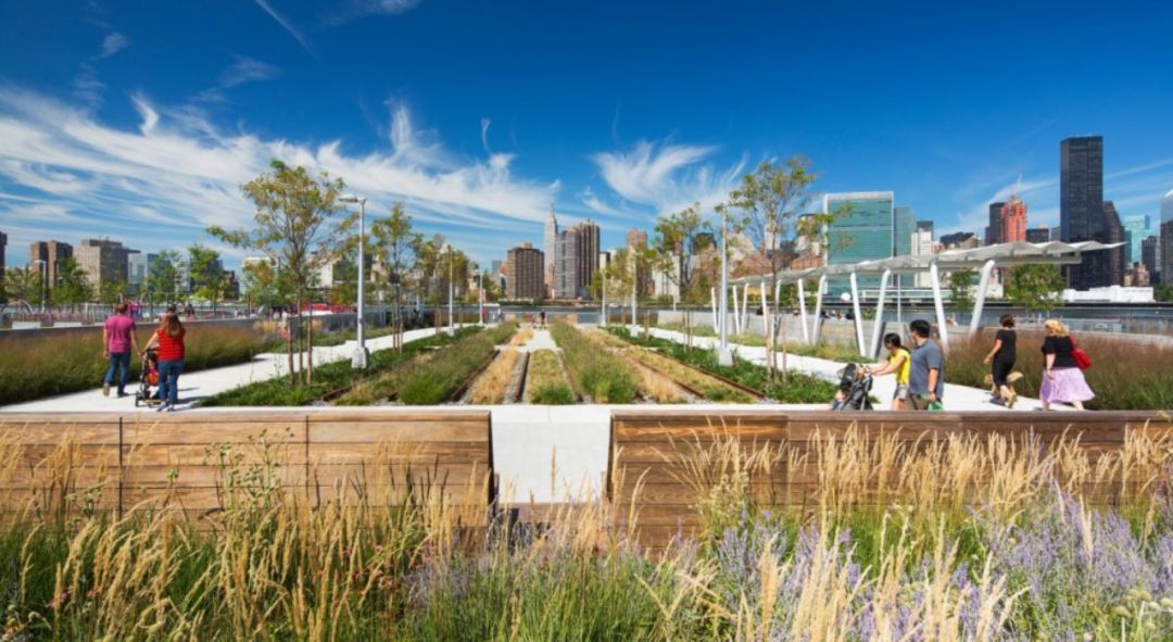 而隨著經(jīng)濟(jì)的發(fā)展,可持續(xù)開發(fā)成為獵人角南濱再次崛起的重要契機(jī)。這塊基地位于紐約市皇后區(qū)的東河(the East River)沿岸,三面環(huán)水,既是城市的濱水區(qū)和門戶區(qū),也是動植物的棲息之所,更是一處自然景致迷人的待開發(fā)區(qū)域。于是,獵人角南濱公園被列為長島市東江總體規(guī)劃中,基于這些場地歷史背景,全新的濱水區(qū)設(shè)計結(jié)合了許多綠色環(huán)保元素及舉措,將這處早已廢棄卻坐擁重要地理位置的濱水區(qū)改造成新型城市生態(tài)示范區(qū)。