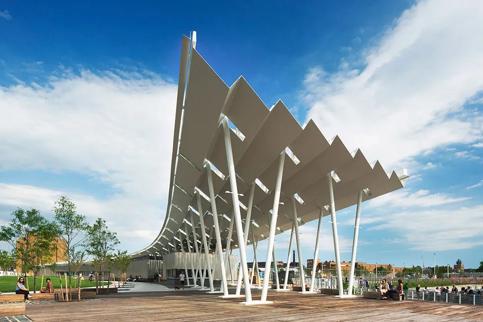 橢圓形草坪:多功能橢圓綠地構(gòu)成了公園中最為開闊的中心區(qū)域,這里不僅可以舉辦各種活動,同時也可以在草坪上欣賞曼哈頓的天際線。這一橢圓綠地形成公園的南北分界,南北沿邊各有一條曲度成弧狀的道路設(shè)施,北邊是一條綿長的林蔭步道,而南邊是帶有褶皺式鋼筋頂棚的遮蔭廊道。廊道包括兩個部分,一部分作為公園的運(yùn)營和維護(hù)點,另一部分則作為休閑場所,為游人提供必要的休閑地點。該設(shè)計面向未來,運(yùn)用新的技術(shù)手段,可收集雨水和太陽能,收集的雨水可以滋養(yǎng)周圍的生物,而太能能為整個公園提供50%以上的供電。同時頂棚可以容納更多的面板,將在未來為公園提供100%的供電。