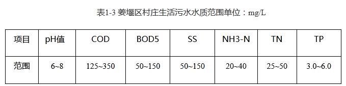 村莊子項目需要覆蓋的村莊收集的均為居民生活污水;來自居民日常的沖廁廢水、淋浴廢水、清洗廢水、廚房廢水等。根據(jù)項目可行性研究報告及批復,確定本項目設計主要進水水質如下表。