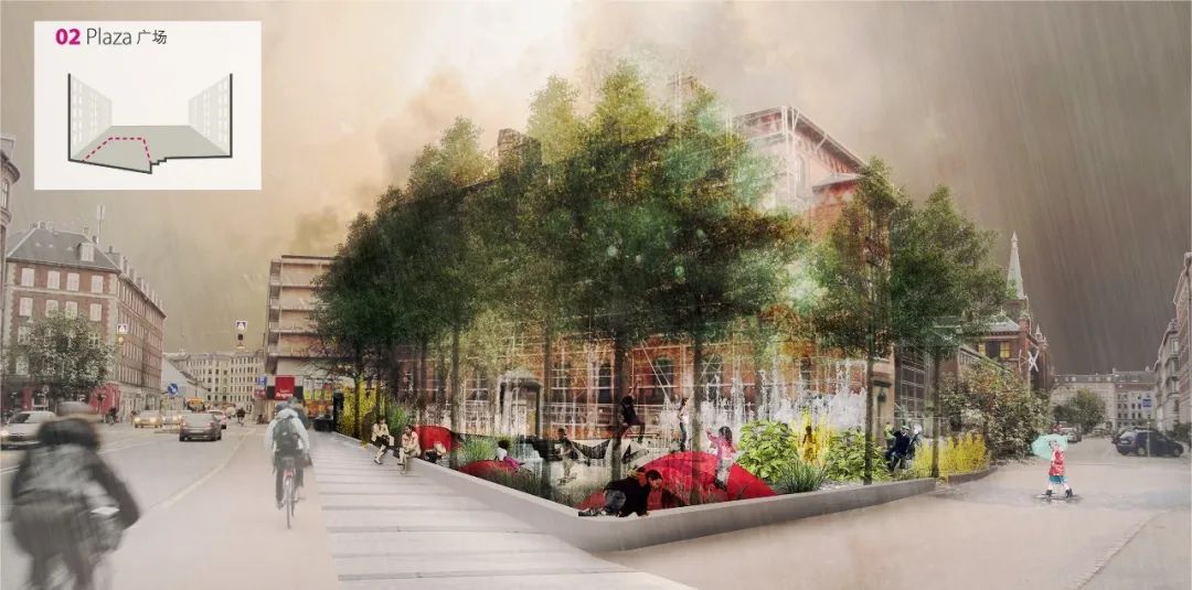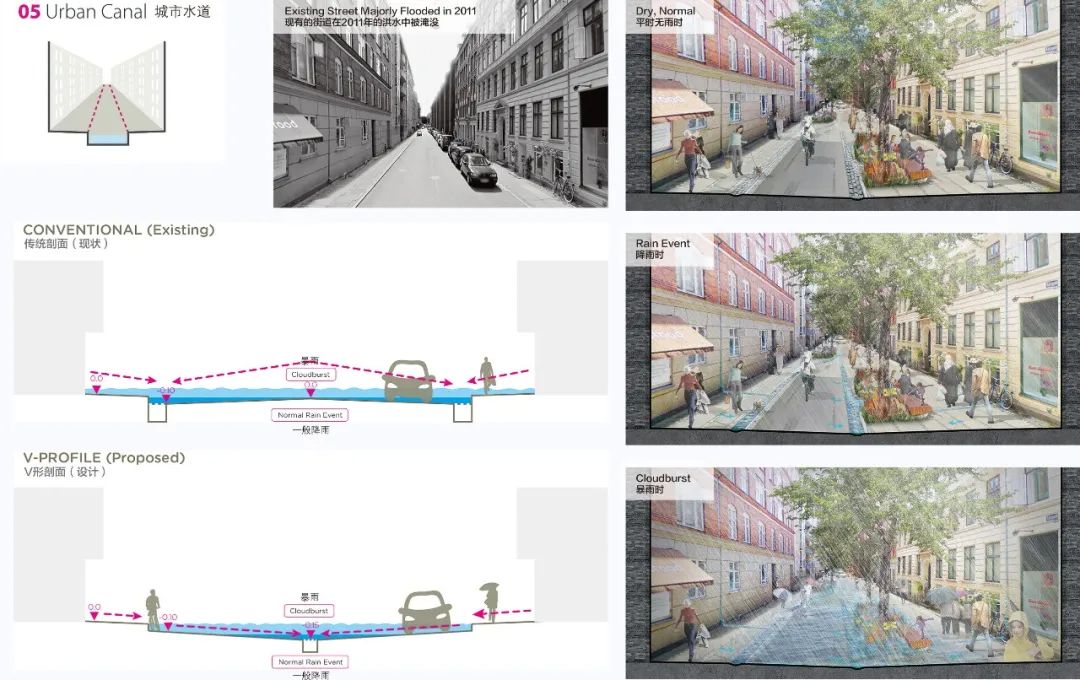 在海綿城市設(shè)計中,對城市宜居性的提升應(yīng)與對氣候的適應(yīng)并重。作為此方面的典范,丹麥首都哥本哈根市的暴雨防控詳細規(guī)劃提出了一套雄心勃勃的計劃,旨在幫助城市免受未來的暴雨之害??傮w規(guī)劃確立后,哥本哈根市政府開始著手為城市的各個分區(qū)制定具體的海綿城市景觀設(shè)計方案。此次景觀設(shè)計將不僅能夠應(yīng)對日益頻繁的極端暴雨天氣,還可以大幅度提升城市的宜居性,造福今時與后世的居民。此外,整套規(guī)劃的總體耗資也低于傳統(tǒng)工程方案。