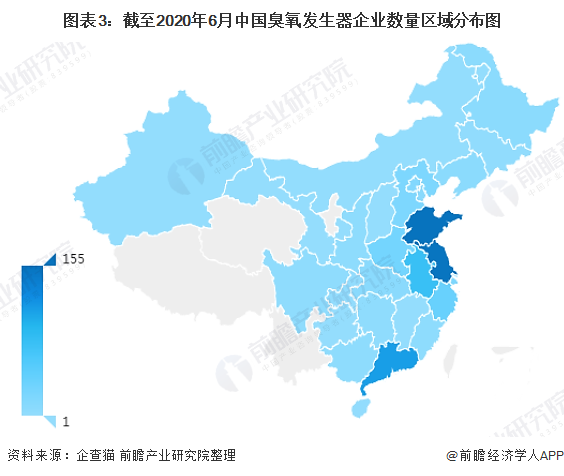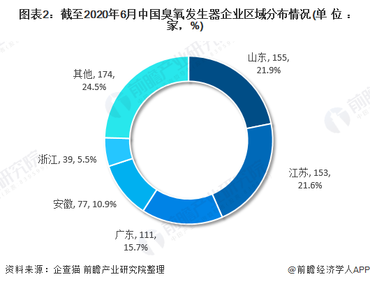 截至2020年6月,通過(guò)企查貓查詢(xún)得出的709家企業(yè)中,大部分企業(yè)分布在山東、江蘇和廣東地區(qū),三個(gè)省份企業(yè)數(shù)量占全國(guó)的59.1%。前五省份企業(yè)數(shù)量占全國(guó)的75.5%。整體來(lái)看,臭氧發(fā)生器行業(yè)區(qū)域市場(chǎng)集中度較高。