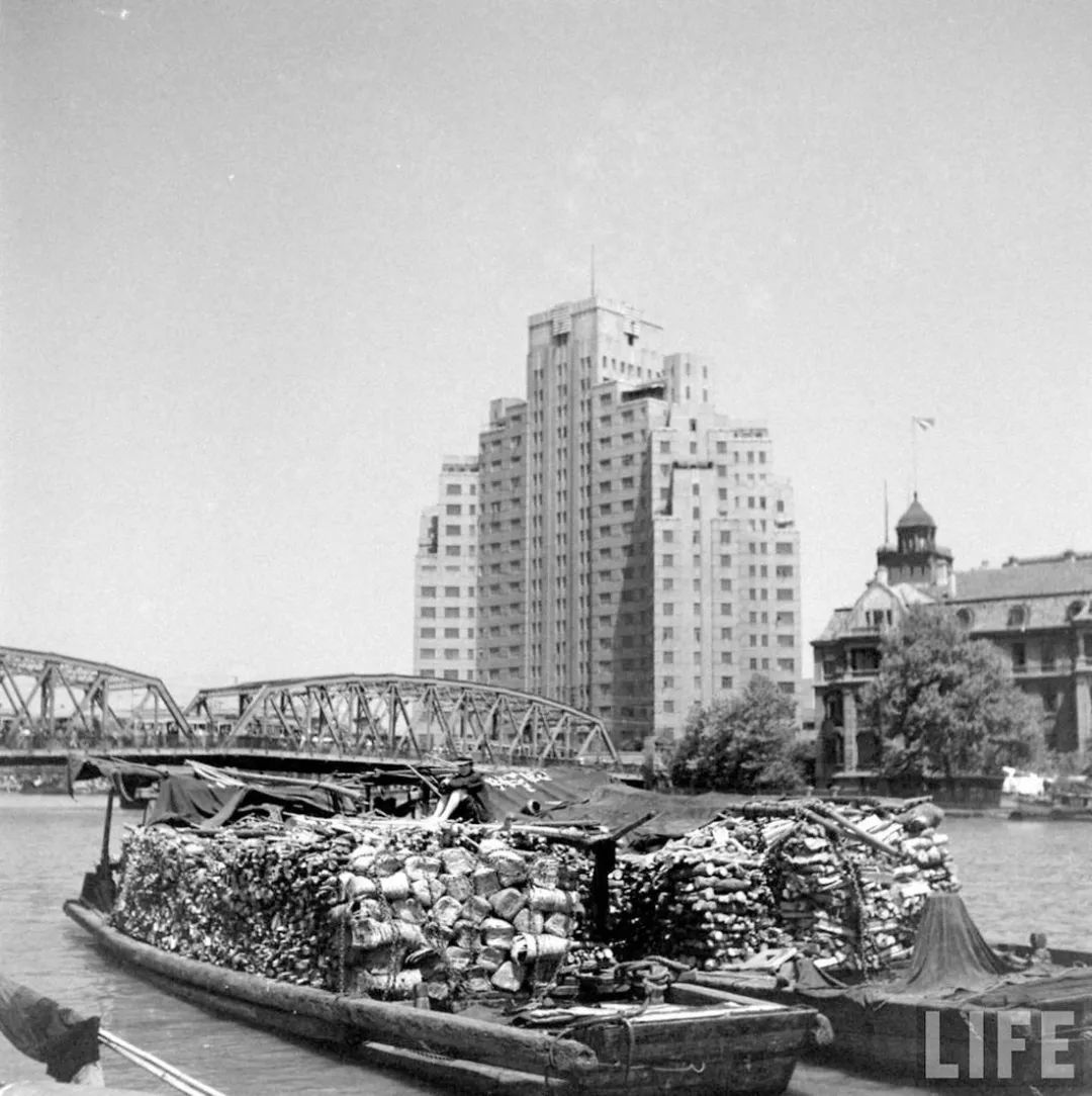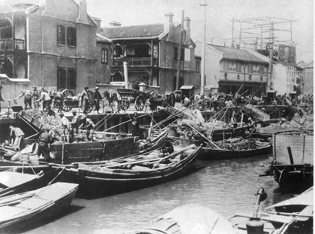 20世紀(jì)40年代后期,蘇州河口中運(yùn)輸垃圾的駁船。圖中可見(jiàn),裝載的垃圾已經(jīng)過(guò)初步歸類(lèi)