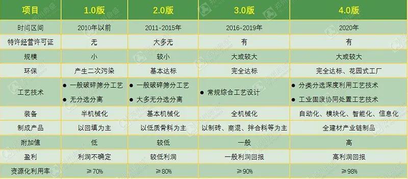 而4.0版是指在現(xiàn)代化工廠資源化處理的基礎上,再附加互聯(lián)網(wǎng)、衛(wèi)星定位等現(xiàn)代高端技術,將建筑垃圾資源化過程中的每一個環(huán)節(jié)精細化控制和處理,生產(chǎn)出利潤空間大、高附加值產(chǎn)品,盈利模式可以不再依靠政府補貼而進行市場化運營的發(fā)展模式。