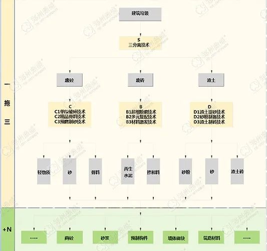 建筑垃圾資源化利用“一拖三”模式是指“一個工藝”,即三分離工藝,將建筑垃圾資源化處置分為三個處置單元,即“廢磚處置單元”、“廢砼處置單元”、“渣土處置單元”,分別加工成砂子、石子及再生水泥、摻和料等產(chǎn)品,并根據(jù)市場需求,以上述產(chǎn)品為原料生產(chǎn)砼、砂漿、墻板、砌塊、預制構(gòu)件等N多種建材產(chǎn)品。處置后,可實現(xiàn)將建筑垃圾“吃干榨凈”,從而實現(xiàn)資源化全利用。