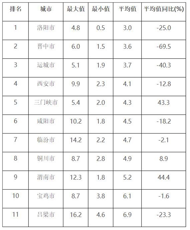 7月,汾渭平原11城市降塵量均值范圍在3.0-6.9噸/平方千米·月之間,平均為4.6噸/平方千米·月,同比下降20.7%。11個(gè)城市降塵量平均值均小于9.0噸/平方千米·月。西安、咸陽、渭南、臨汾、呂梁等5個(gè)城市降塵量最大值大于9.0噸/平方千米·月,渭南、三門峽、銅川等3個(gè)城市降塵量平均值同比不降反升。汾渭平原11城市7月降塵監(jiān)測結(jié)果詳見附表2。