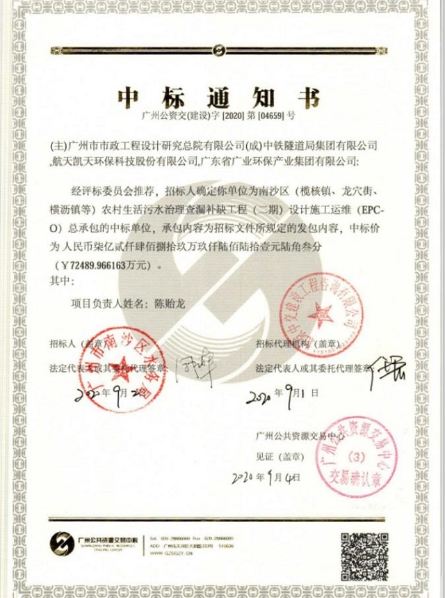 9月4日,航天凱天環(huán)??萍脊煞萦邢薰韭?lián)合廣州市市政工程設(shè)計研究總院有限公司、中鐵隧道局集團有限公司、廣東省廣業(yè)環(huán)保產(chǎn)業(yè)集團有限公司中標(biāo)南沙區(qū)(欖核鎮(zhèn)、龍穴街、橫瀝鎮(zhèn)等)農(nóng)村生活污水治理查漏補缺工程(二期)設(shè)計施工運維(EPC+O)總承包項目,中標(biāo)額為7.25億元。該項目的中標(biāo),打破了航天凱天環(huán)保單個EPC+O模式最大中標(biāo)額記錄。本項目為農(nóng)村生活污水治理查漏補缺工程,主要為新建及改造雨污水管網(wǎng)和污水處理站,采用MBR等先進污水處理工藝,針對農(nóng)村范圍內(nèi)的污染源進村入戶的污水建設(shè)獨立收集管網(wǎng),確保雨污分流,污水全收集全處理,進而有效控制溢流污染,實現(xiàn)村域內(nèi)水體基本消除黑臭。