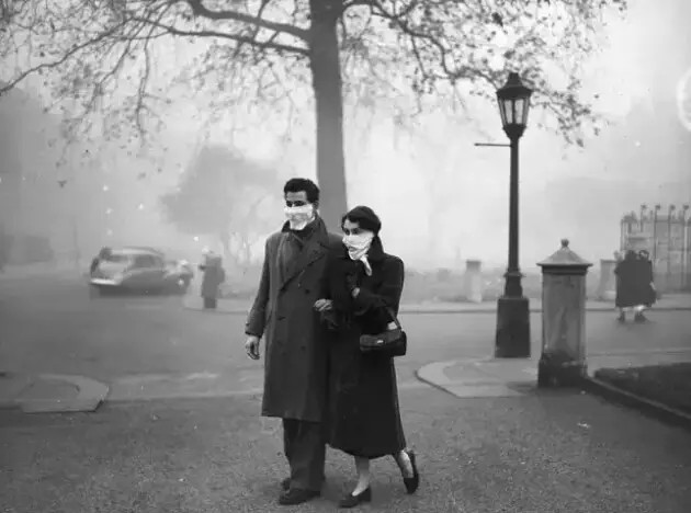1952年12月4日至9日,倫敦上空受高壓系統(tǒng)控制,大量工廠生產(chǎn)和居民燃煤取暖排出的廢氣難以擴散,積聚在城市上空。倫敦城被黑暗的迷霧所籠罩,馬路上幾乎沒有車,人們小心翼翼地沿著人行道摸索前進。