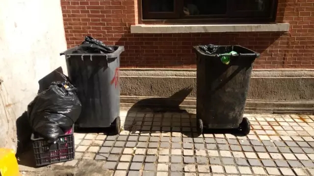 兩只垃圾桶就這么放著,氣味襲人
