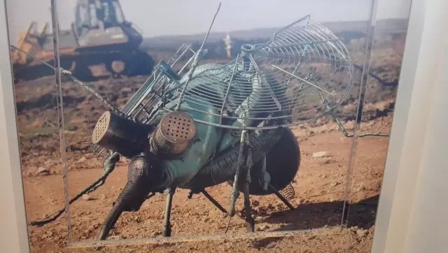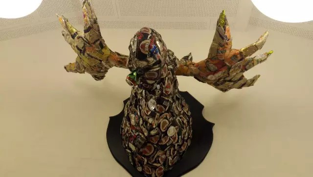 辦公室門口拜訪著一個利用廢棄物制作的小機器人模型