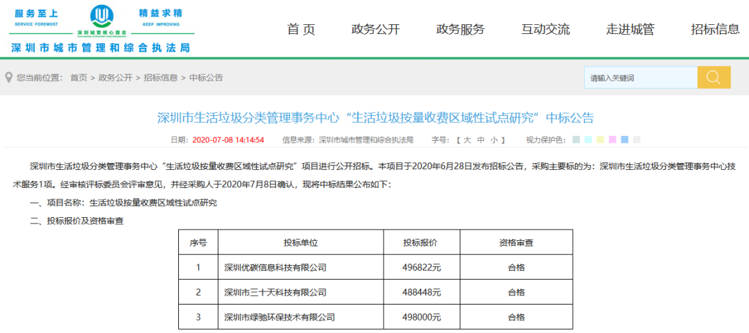 7月8日,深圳市生活垃圾分類管理事務(wù)中心“生活垃圾按量收費區(qū)域性試點研究項目”開標(biāo),服務(wù)期限:2020年7月10日-2020年12月10日。