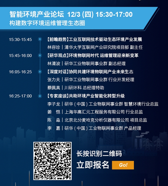 具體聊什么?在12月3日15:30—17:00時召開的智慧環(huán)境產(chǎn)業(yè)論壇(←點擊進(jìn)入報名詳情頁)上,8位業(yè)界專家及企業(yè)代表將用翔實的數(shù)據(jù)和生動案例,從4大熱點話題解析“構(gòu)建 數(shù)字環(huán)境運維管理生態(tài)圈”。而在每個議題的專家報告中都緊緊圍繞著技術(shù)創(chuàng)新以及推動產(chǎn)業(yè)升級,提前劇透一下: