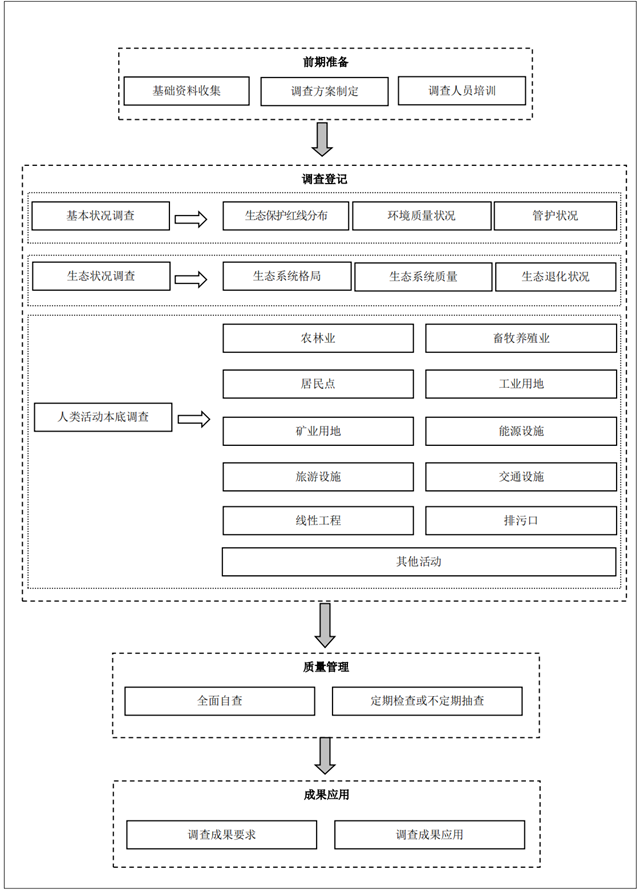 指為滿足生態(tài)保護(hù)紅線監(jiān)管需求,對生態(tài)保護(hù)紅線基本狀況、生態(tài)狀況、人類活動本底情況和 其他相關(guān)基礎(chǔ)信息進(jìn)行的調(diào)查統(tǒng)計。調(diào)查工作主要通過現(xiàn)場調(diào)查、遙感監(jiān)測、資料收集等技術(shù)手段 開展,以縣級行政區(qū)為基本單元進(jìn)行匯總。