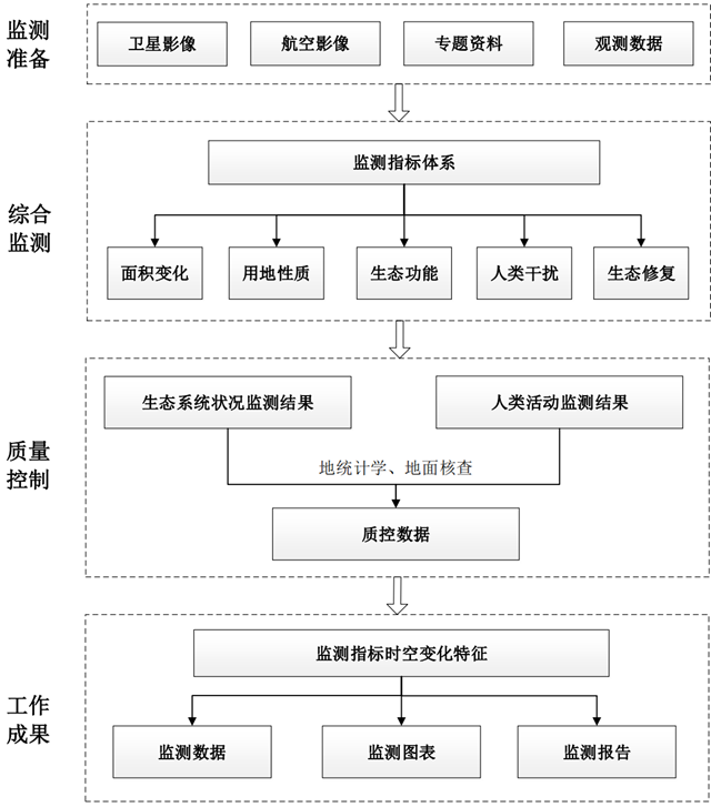 采用衛(wèi)星遙感、近地面航空遙感(無人機(jī))、地面監(jiān)測相結(jié)合,以衛(wèi)星遙感監(jiān)測為主的技術(shù)方法,即先利用高時(shí)空衛(wèi)星遙感開展監(jiān)測因子普查,然后利用無人機(jī)對(duì)典型地區(qū)進(jìn)行抽查,再到野外現(xiàn)場開展關(guān)鍵生態(tài)因子監(jiān)測和存疑斑塊核查。