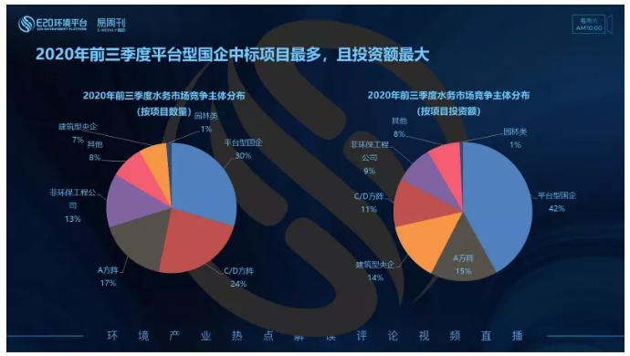 進(jìn)一步分析不同類型競(jìng)爭(zhēng)主體獲取不同類水務(wù)項(xiàng)目的傾向性可以發(fā)現(xiàn):2020年前三季度傳統(tǒng)水務(wù)A方陣企業(yè)在市政污水板塊競(jìng)爭(zhēng)優(yōu)勢(shì)最明顯,無(wú)論是項(xiàng)目數(shù)量還是所占市場(chǎng)份額占比均最大,在村鎮(zhèn)污水及水環(huán)境領(lǐng)域市場(chǎng)占比都相對(duì)較小。