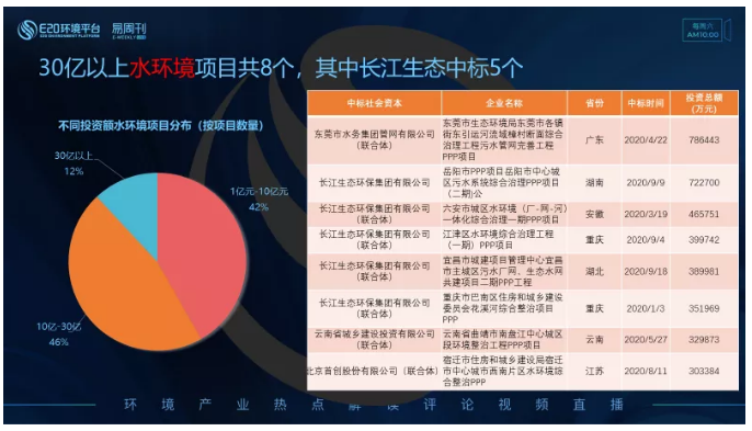 右表為“30億以上水環(huán)境類項(xiàng)目”,共8個(gè),其中長(zhǎng)江生態(tài)環(huán)保集團(tuán)有限公司中標(biāo)5個(gè),且僅在9月份就中標(biāo)3個(gè)30億以上水環(huán)境項(xiàng)目。