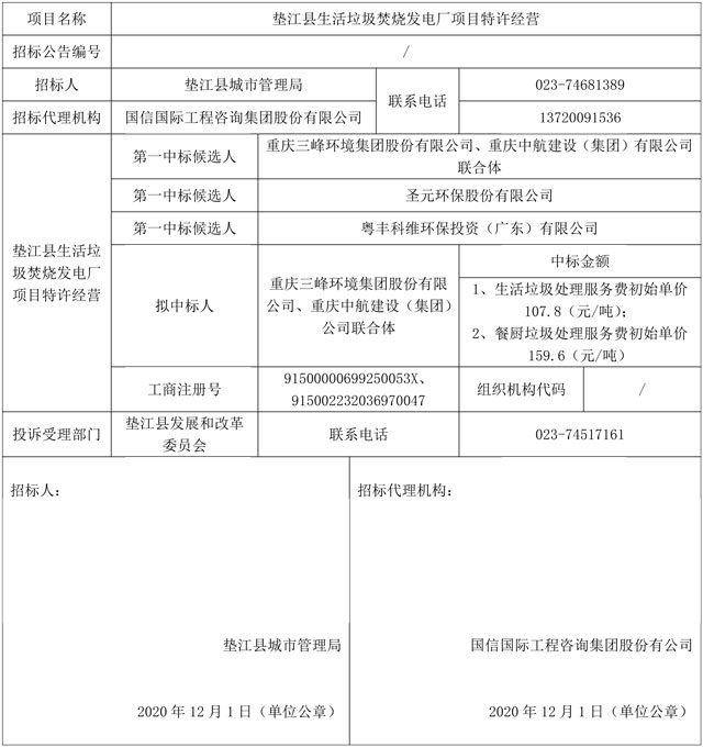 日前,墊江縣生活垃圾焚燒發(fā)電廠項(xiàng)目特許經(jīng)營中標(biāo)候選人公示,重慶三峰環(huán)境集團(tuán)股份有限公司、重慶中航建設(shè)(集團(tuán))有限公司聯(lián)合體為該項(xiàng)目第一中標(biāo)候選人,中標(biāo)金額為生活垃圾處理服務(wù)費(fèi)初始單價(jià)107.8元/噸、餐廚垃圾處理服務(wù)費(fèi)初始單價(jià)159.6元/噸。