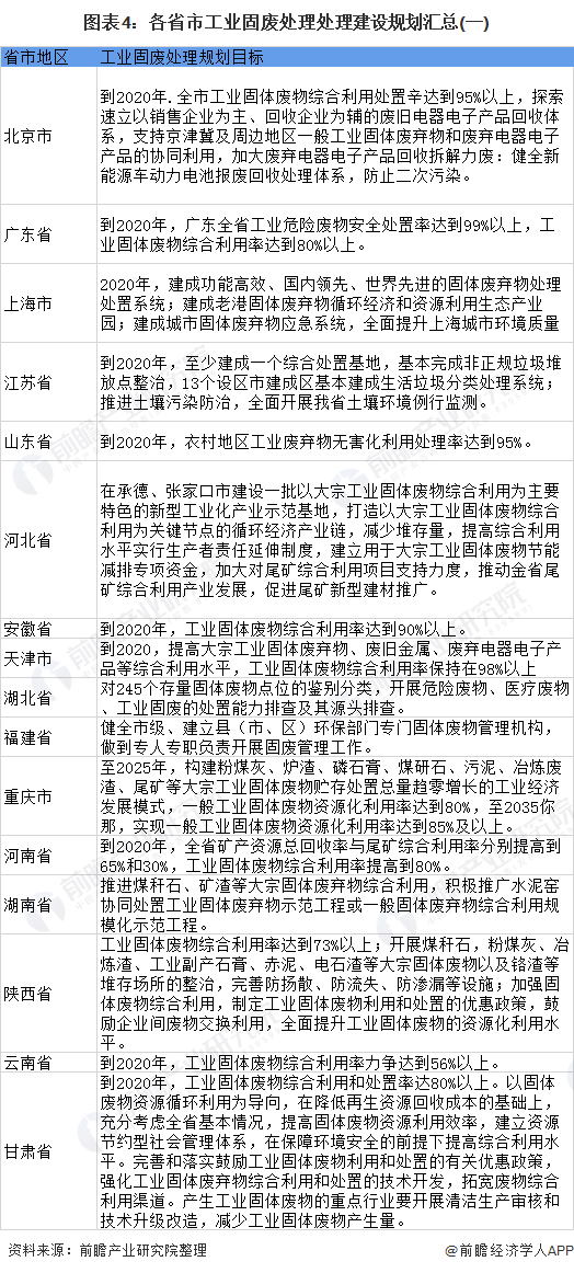 根據(jù)前瞻產(chǎn)業(yè)研究院匯總,截至2020年12月我國已經(jīng)有30多個省市地區(qū)就工業(yè)固廢處理的發(fā)展給出了相關的指導意見以及配套的措施,其中19個省份均已制定工業(yè)固廢處理綜合利用率階段性目標,并陸續(xù)出臺具體細化的地方性工業(yè)固廢處理政策扶持行業(yè)發(fā)展。