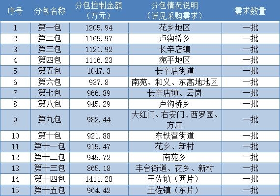 北京市豐臺(tái)區(qū)非環(huán)衛(wèi)管理公廁管護(hù)項(xiàng)目發(fā)布招標(biāo)公告。項(xiàng)目共分為15個(gè)包,總預(yù)算金額約1.55億。