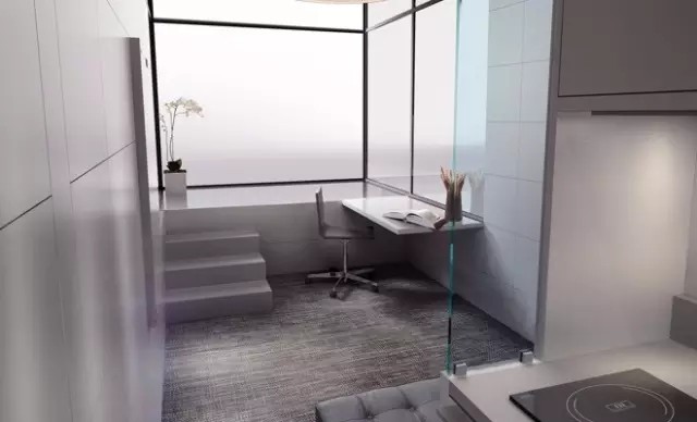 樣板房看上去還是垃圾箱的形狀,格調卻要高很多。用特殊玻璃SageGlass制成的落地窗,不僅看起來高端大氣上檔次,還能根據室外陽光強度自動遮光。