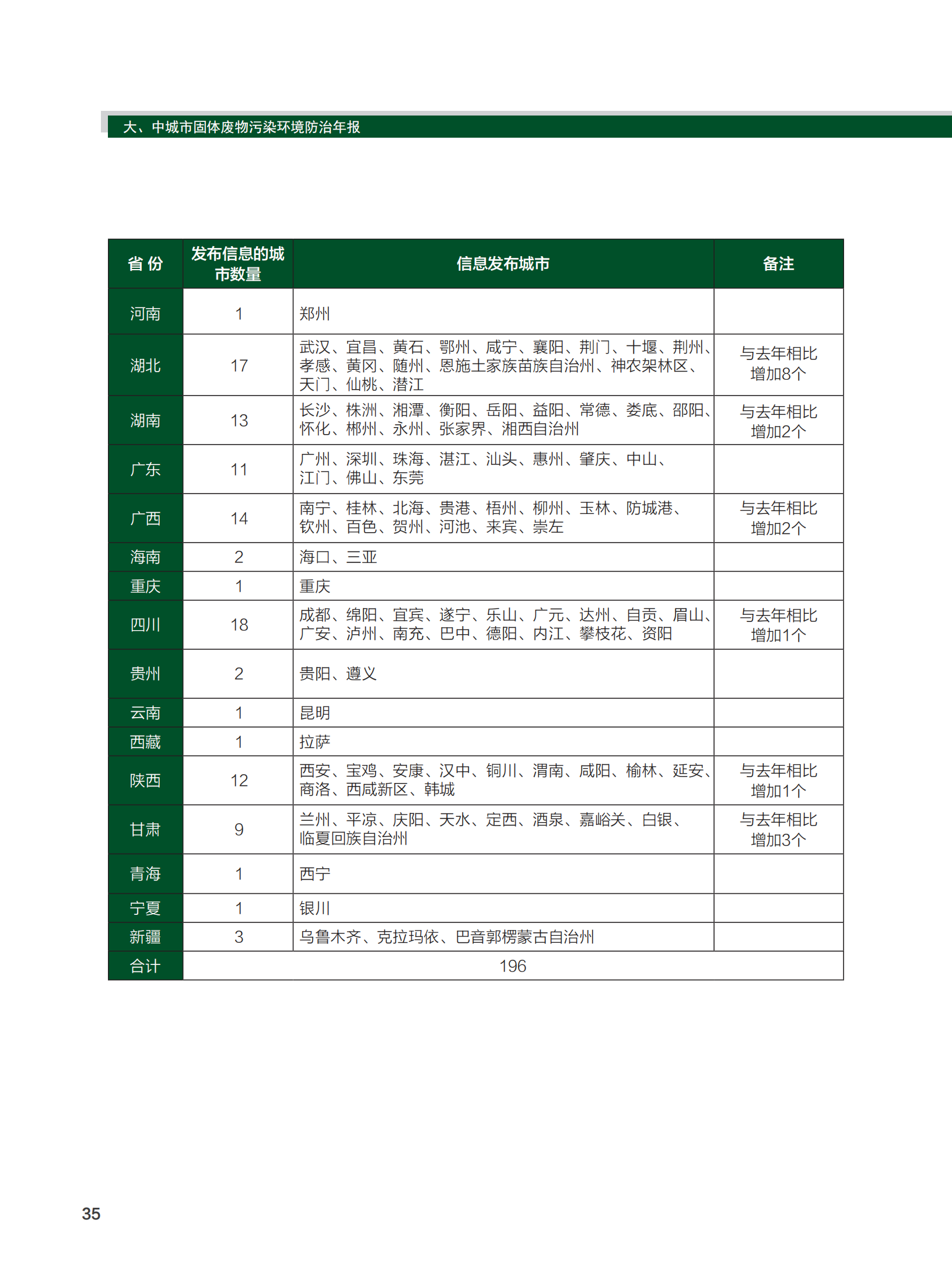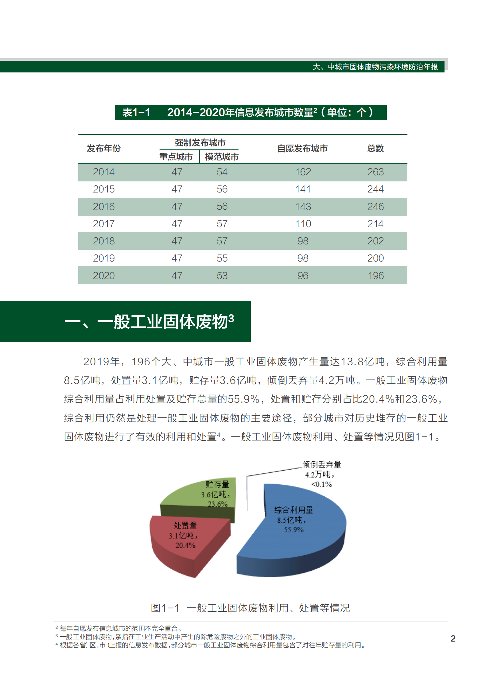 2020年,全國共有196個大、中城市向社會發(fā)布了2019年固體廢物污染環(huán)境防治信息。其中,應開展信息發(fā)布工作的47個環(huán)境保護重點城市和53個環(huán)境保護模范城市均已按照規(guī)定發(fā)布信息,另外還有96個城市自愿開展了信息發(fā)布工作(詳見附表一)。