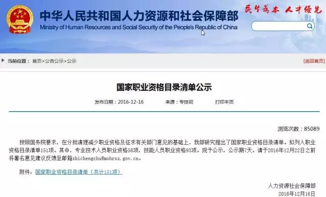 12月16日,人力資源社會(huì)保障部公示提出了國家職業(yè)資格目錄清單。擬列入職業(yè)資格目錄清單151項(xiàng)。其中,專業(yè)技術(shù)人員職業(yè)資格58項(xiàng),技能人員職業(yè)資格93項(xiàng)。公示期7天,至2016年12月22日結(jié)束。