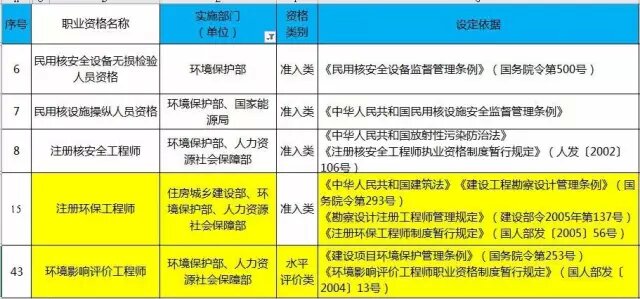 其中:涉及環(huán)境保護(hù)部實(shí)施的部門共5項(xiàng),分別為:民用核安全設(shè)備無損檢驗(yàn)人員資格、民用核設(shè)施操縱人員資格、注冊核安全工程師注冊環(huán)保工程師為準(zhǔn)入類,環(huán)境影響評價(jià)工程師為水平評價(jià)類